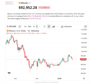 On Monday Bitcoin’s price action is showing near-term consolidation after a pointy pullback, with BTC trading round $93,000 following a rejection from the mid-$90,000s.